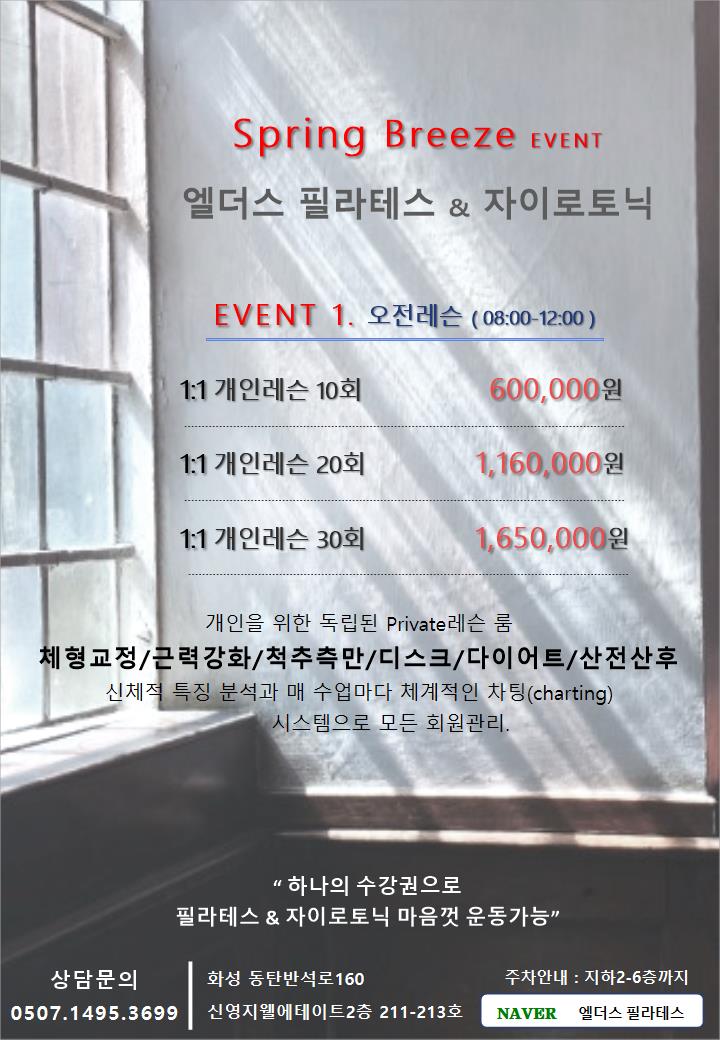 ” 2026. 02. 23 – 03. 31 “ Spring Breeze EVENT EVENT 1. 오전레슨 ( 08:00-12:00 ) 1:1 개인레슨 10회 600,000원 1:1 개인레슨 20회 1,160,000원